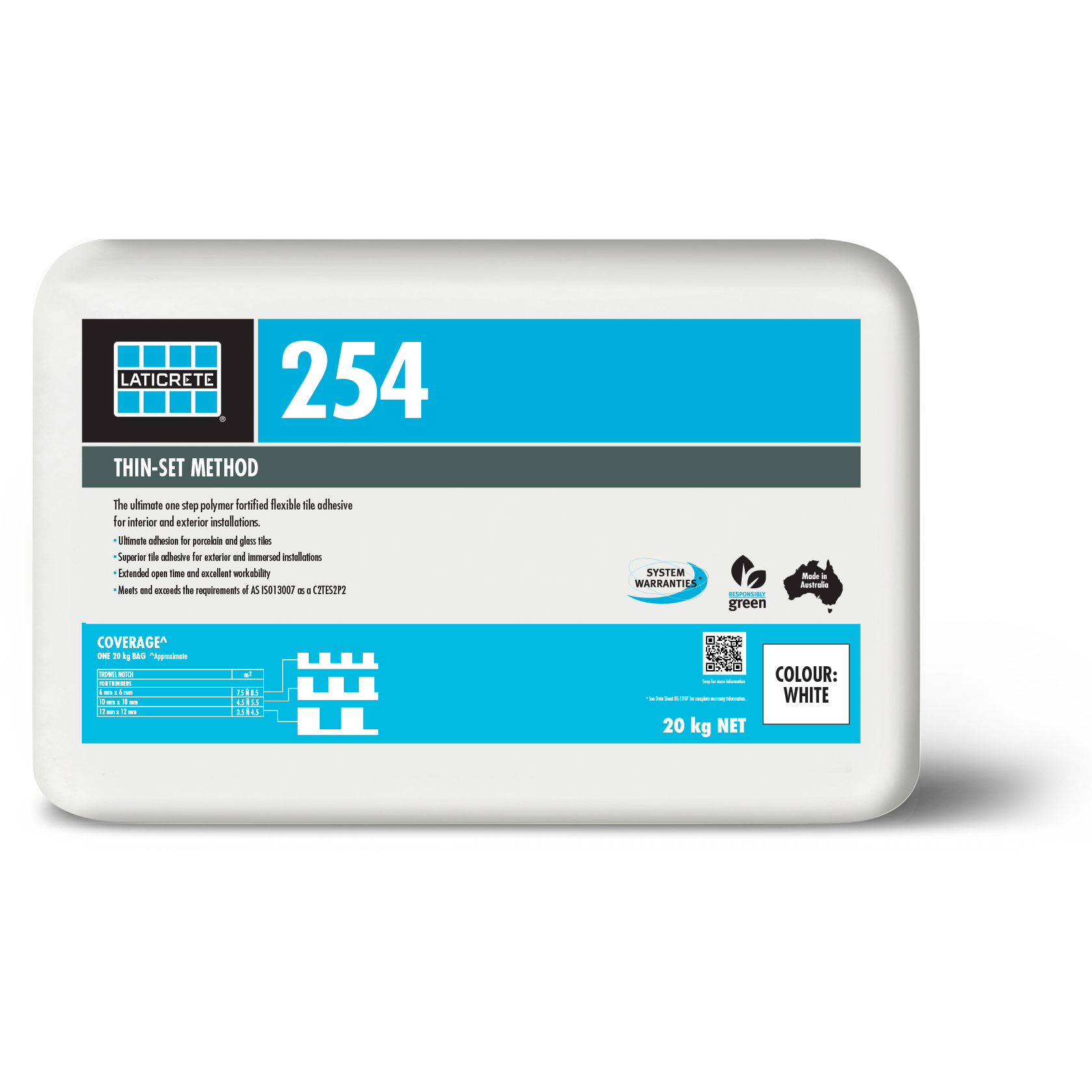 254 is the ultimate one-step, polymer fortified, thin-set adhesive for interior and exterior installation of ceramic tile, reduced thickness porcelain, stone, quarry tile, pavers and brick. 254 adhesive, designed to just mix with water, has a long open time with unsurpassed adhesion and workability. May be mixed with PERMACOLOR® Select pigment packs for a coloured adhesive.