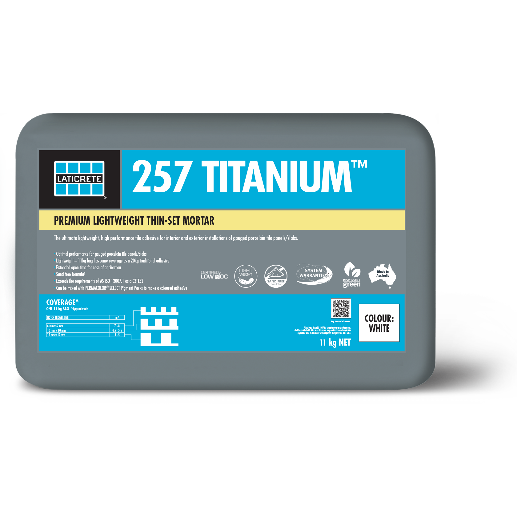 The ultimate, sand free, lightweight, polymer fortified, thin-set adhesive for the installation of ceramic, stone and glass tiles. 257 TITANIUM is designed with key features to facilitate the installation of large format porcelain panels and slabs with its long open time, good adjustability and superior adhesive for maximum coverage and easier handling. Rated for exterior installations.